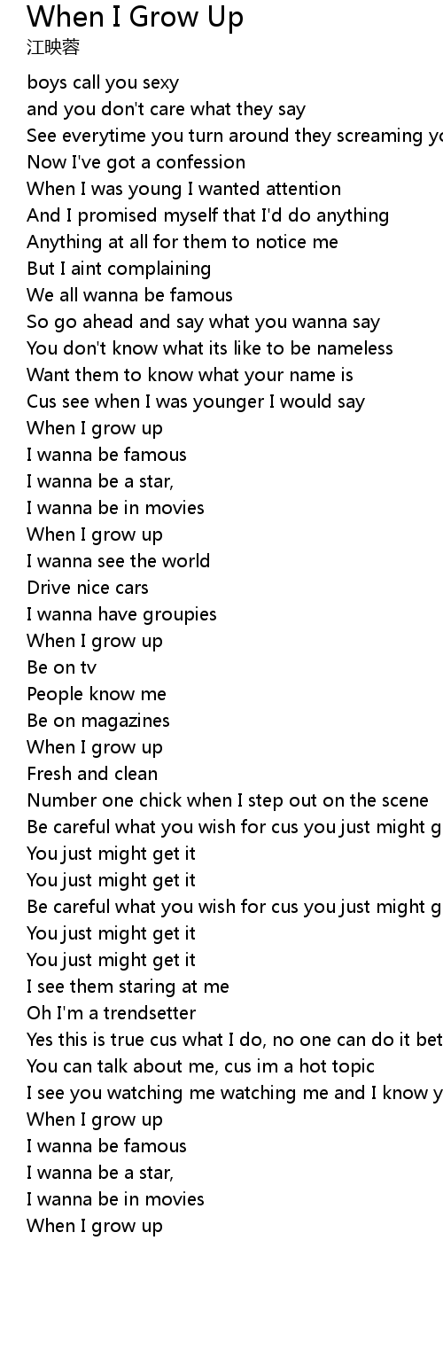 The Pussycat Dolls - When I Grow Up (Lyrics) "When I grow up, I wanna be famous" Tiktok Song, Follow our spotify playlist (TikTok Bangers) . We Have got 13 pix about When I Grow Up Lyrics images, photos, pictures, backgrounds, and more. In such page, we additionally have number of images out there. Such as png, jpg, animated gifs, pic art, symbol, blackandwhite, pic, etc. "The Pussycat Dolls - When I Grow Up (Lyrics)", DONT' STEAL!!! LIKE, SHARE & SUBSCRIBE!!! THANKS FOR ALL, LOVE YA.. "The Pussycat Dolls - When I Grow Up (Official Music Video)", REMASTERED IN HD! Music video by The Pussycat Dolls performing When I Grow Up. (C) 2008 Pussycat Dolls, LLC ..